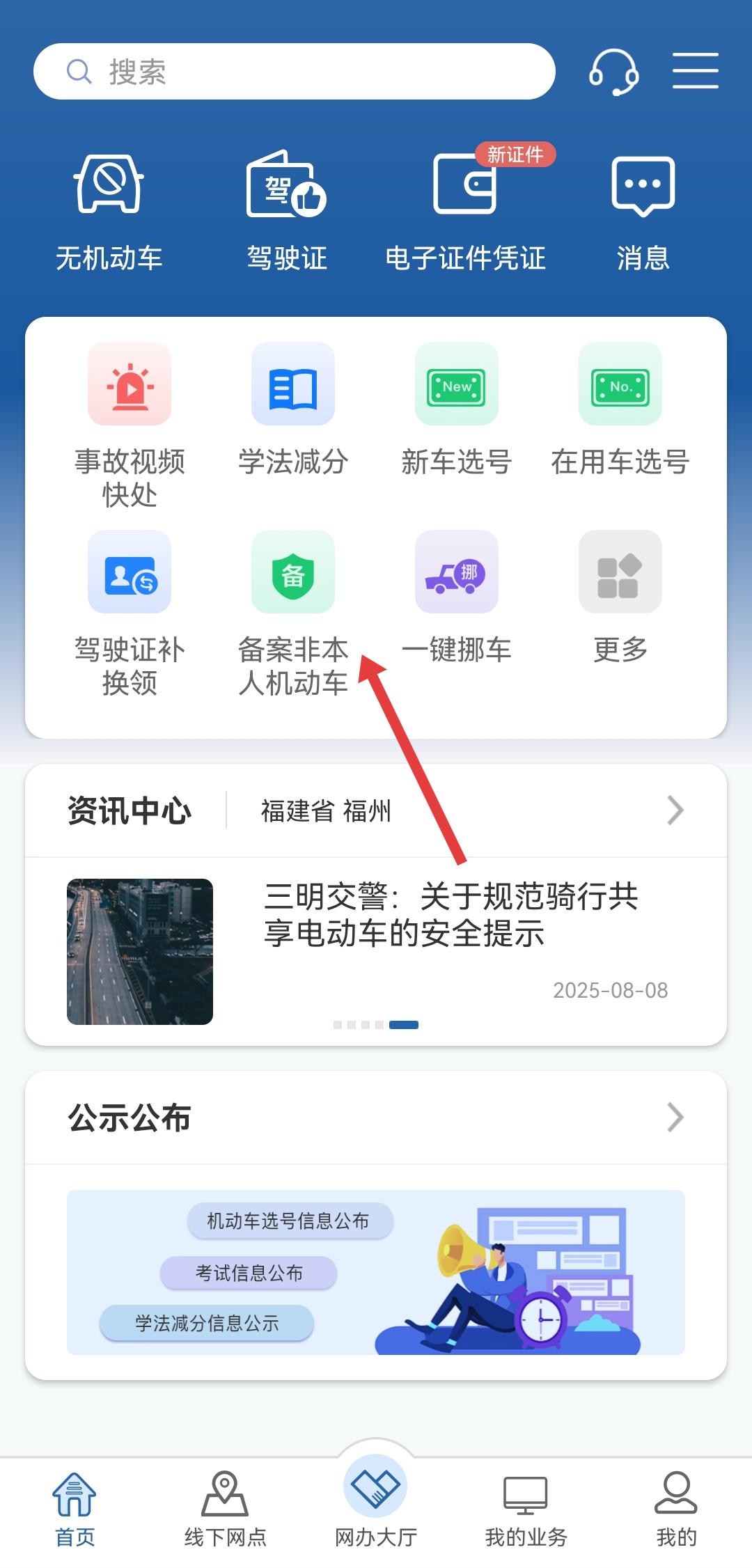 1、需要打開交管12123APP首頁,然后找到并點擊備案非本人機動車的選項,進(jìn)入備案的流程。