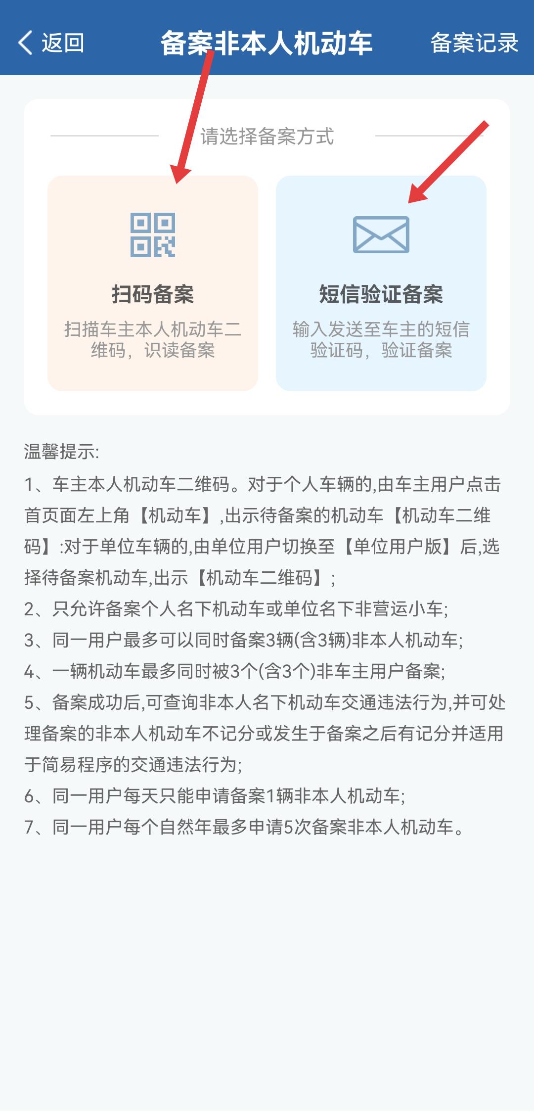 2、在備案非本人機動車頁面,可以選擇備案方式掃碼備案或短信驗證備案,按照提示進(jìn)行操作。