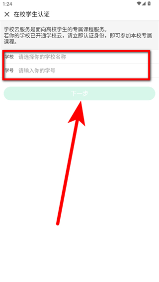 4、進(jìn)入在校生認(rèn)證界面后,在學(xué)校欄選擇自己的學(xué)校名稱,在學(xué)號欄輸入學(xué)號,然后點(diǎn)擊下一步,按提示完成認(rèn)證。