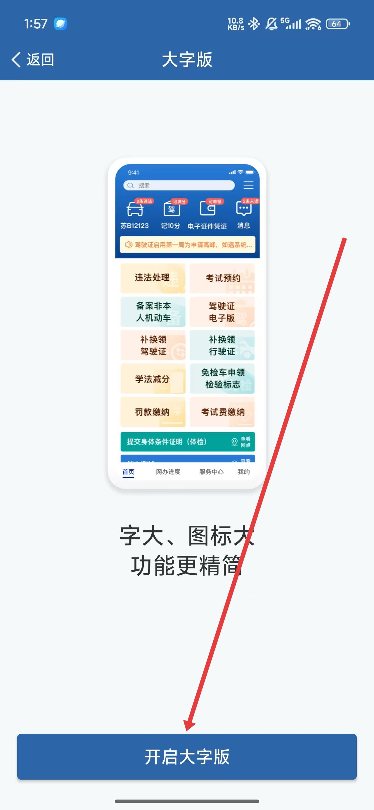 3、在進(jìn)入到大字版頁(yè)面中,可以點(diǎn)擊底部的開(kāi)啟大字版按鈕,開(kāi)啟該功能。