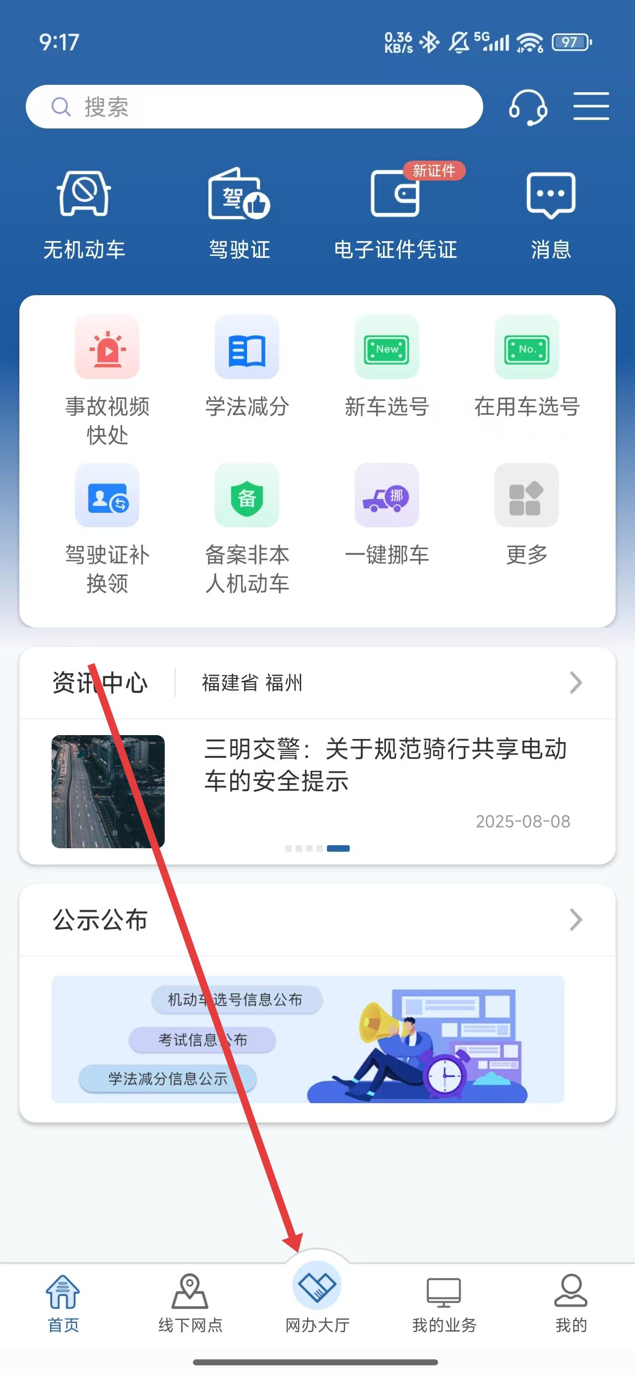1、在交管12123應(yīng)用首頁中,找到網(wǎng)辦大廳按鈕點(diǎn)擊進(jìn)入查看更多服務(wù)。