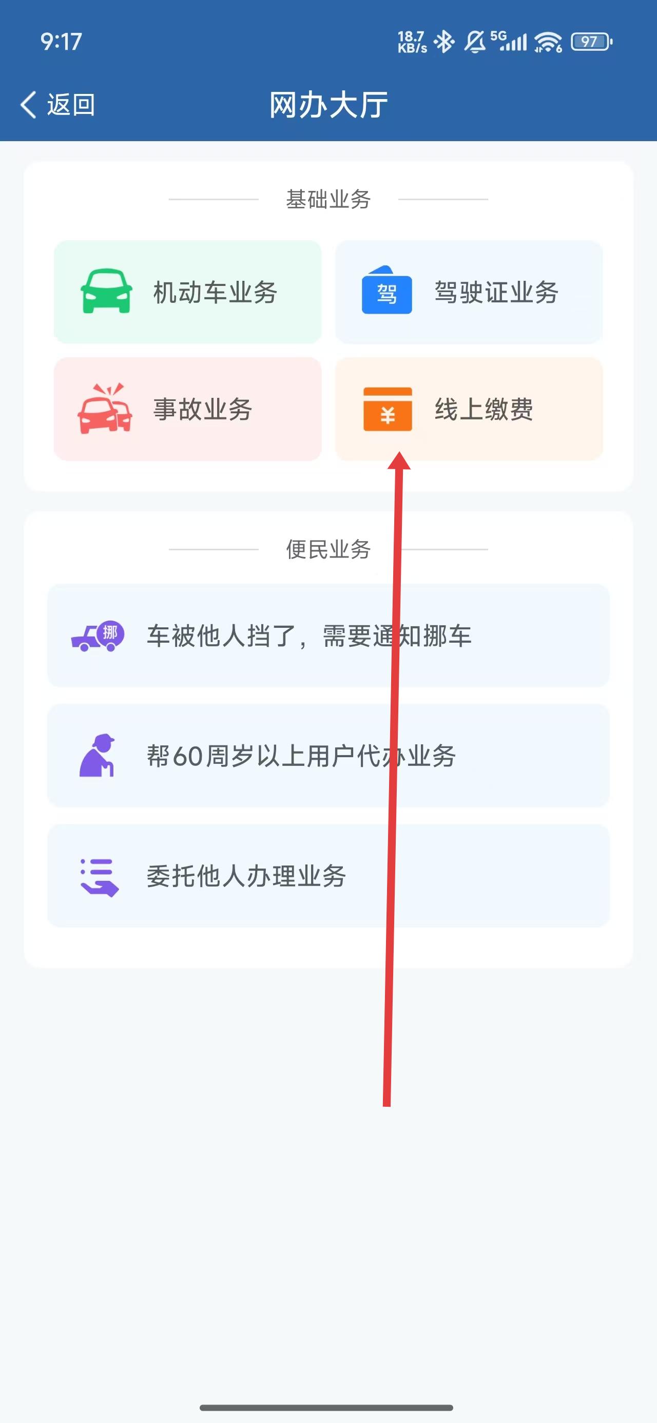 2、在進(jìn)入到網(wǎng)辦大廳頁面中后,可以在基礎(chǔ)業(yè)務(wù)模塊下找到線上繳費(fèi),點(diǎn)擊進(jìn)入繳費(fèi)業(yè)務(wù)辦理。