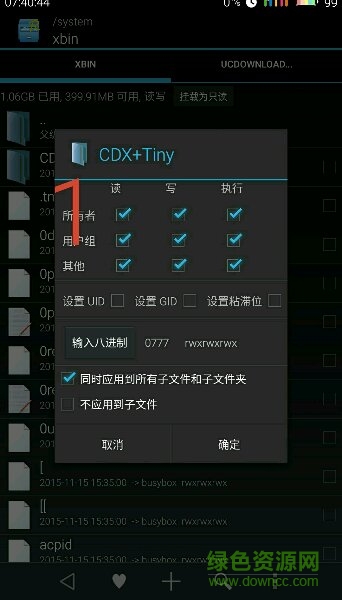 下載cdx+tiny整合版,解壓。把解壓后的CDX+Tiny文件夾復(fù)制到system/xbin,然后權(quán)限全滿,(同時應(yīng)用到子文件和文件夾,不懂的看圖1)