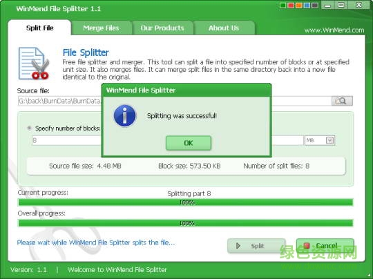 winmend file splitter免費版是一個免費的文件分割和合并工具。它可以把文件分割成幾塊,或分割指定數(shù)量單位指定大小的文件,這樣他們就可以很容易地附加到電子郵件,或可移動存儲設(shè)備例如USB驅(qū)動器,軟盤,mp3,mp4。有需要的就來綠色資源網(wǎng)下載試玩吧!