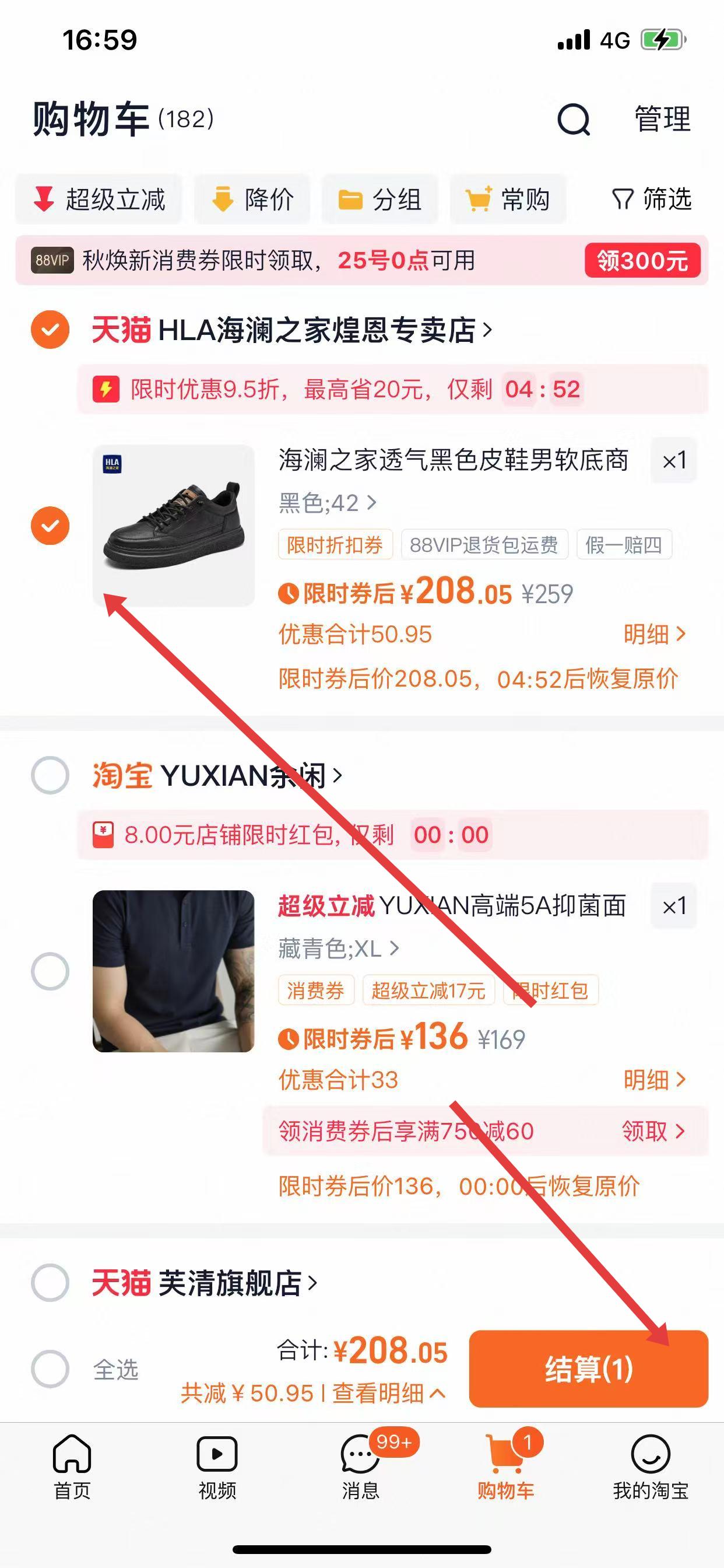 1.、打開(kāi)淘寶APP,進(jìn)入「購(gòu)物車(chē)」,勾選要送朋友的商品,點(diǎn)擊右下角「結(jié)算」,進(jìn)入訂單頁(yè)。