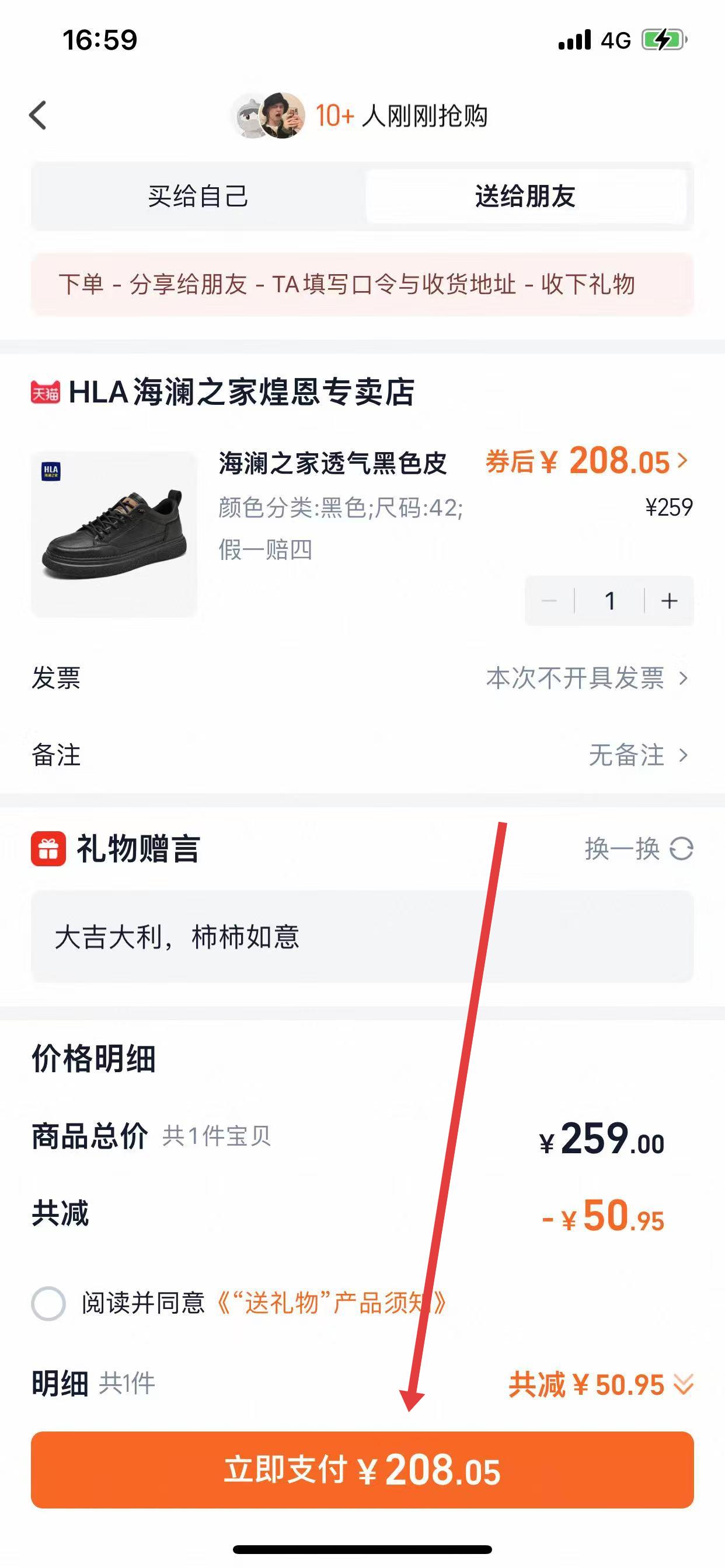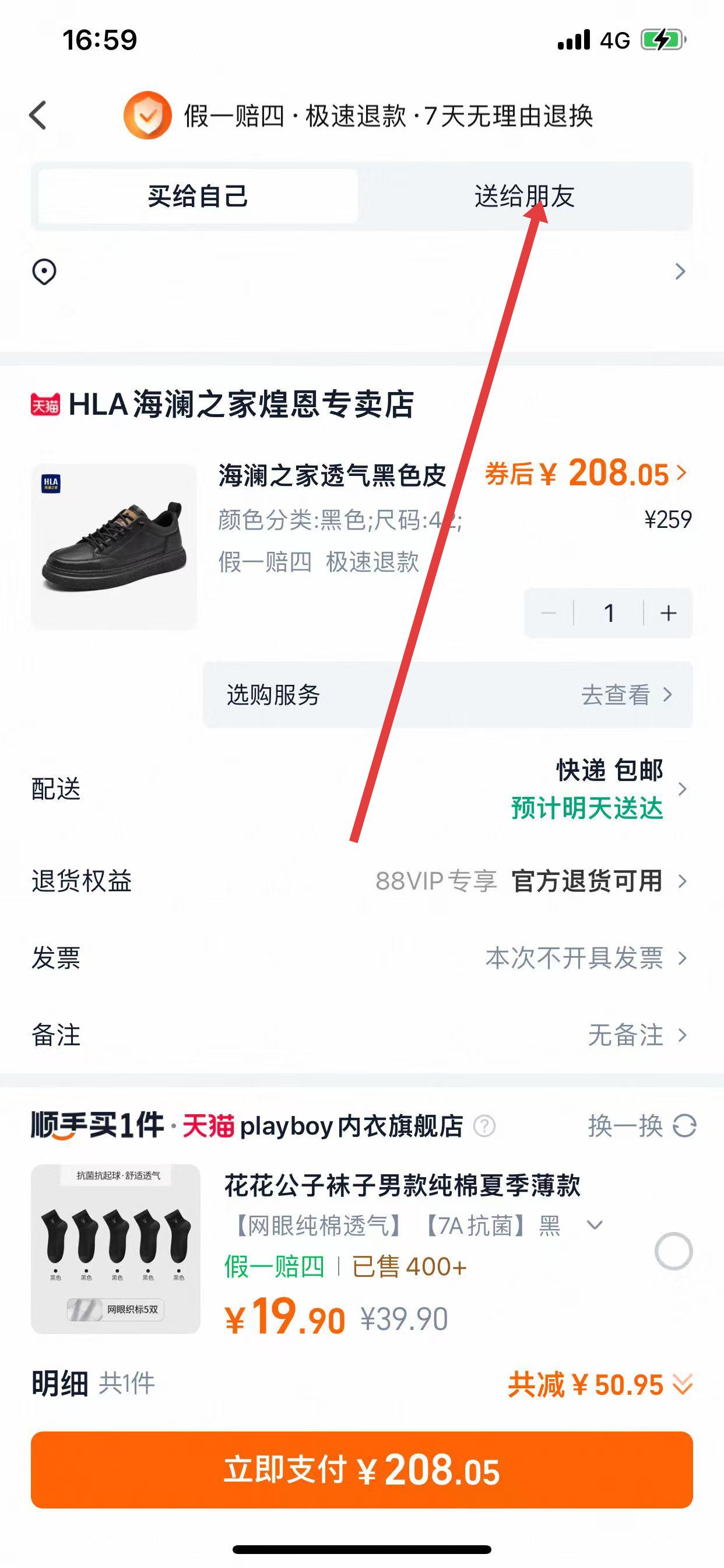 2、在訂單確認(rèn)頁(yè),點(diǎn)擊頂部「送給朋友」選項(xiàng),切換成為送禮模式。