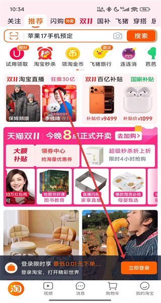 1、在進(jìn)入到淘寶首頁(yè)中時(shí),可以點(diǎn)擊立即登錄按鈕,登錄后點(diǎn)擊我的淘寶,進(jìn)入我的主頁(yè)。