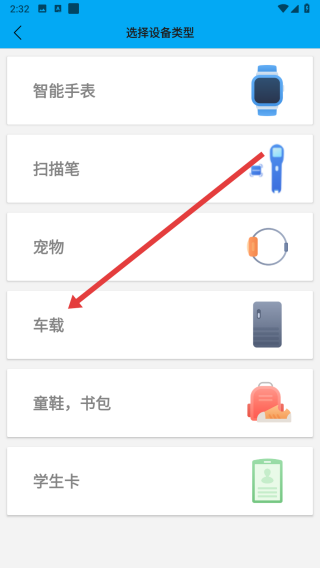 3、在跳轉(zhuǎn)到現(xiàn)在設(shè)備類型頁(yè)面后,可以點(diǎn)擊車載選項(xiàng),進(jìn)入添加車載設(shè)備。