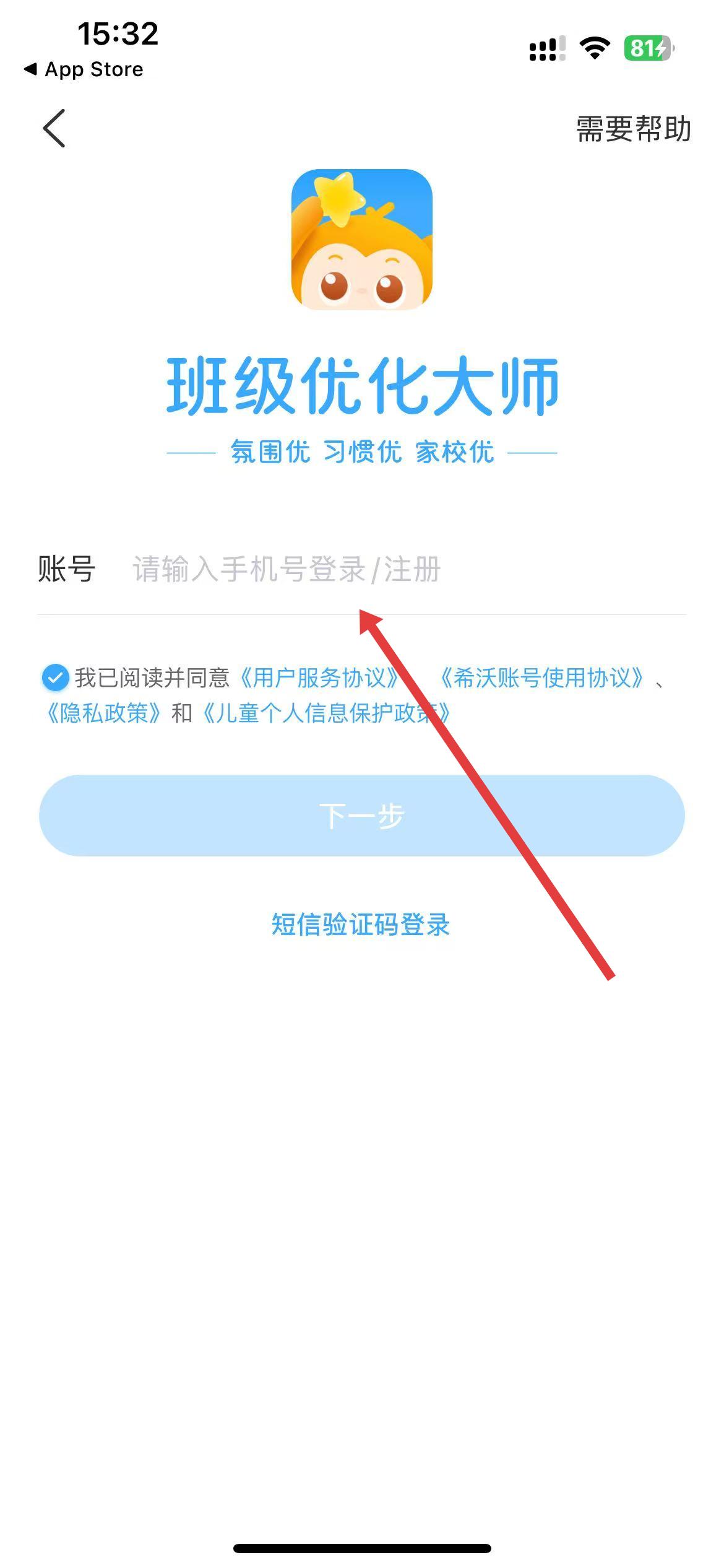 1、打開(kāi)班級(jí)優(yōu)化大師app在登錄界面的賬號(hào)輸入框中填入用于登錄/注冊(cè)的手機(jī)號(hào),并勾選下方的相關(guān)協(xié)議。