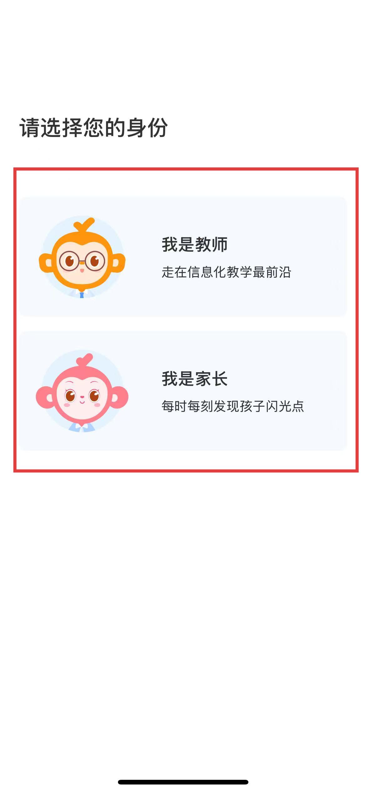 3、注冊(cè)成功后進(jìn)入選擇身份界面,根據(jù)自身情況選擇我是教師或者我是家長(zhǎng),完成后續(xù)相關(guān)設(shè)置即可使用賬號(hào)。