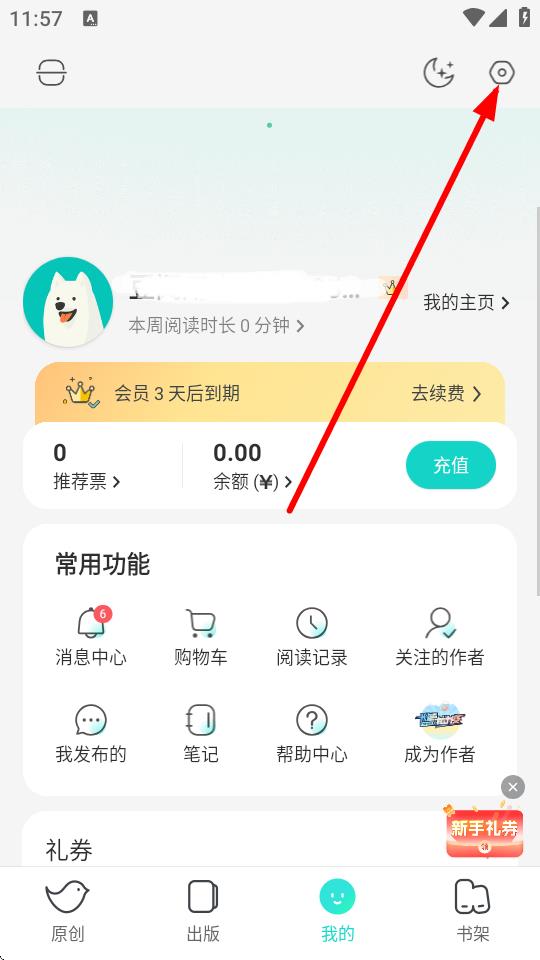 2、在我的頁面右上角,點擊設(shè)置圖標(biāo)齒輪狀進(jìn)入設(shè)置界面。