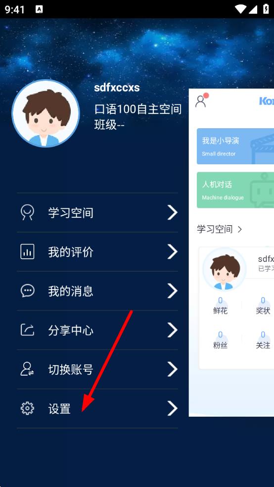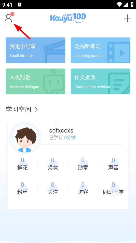 1、打開口語100APP,點擊左上角的頭像圖標,打開側(cè)邊菜單欄。