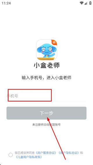 1、打開(kāi)小盒老師,輸入手機(jī)號(hào),點(diǎn)擊下一步。