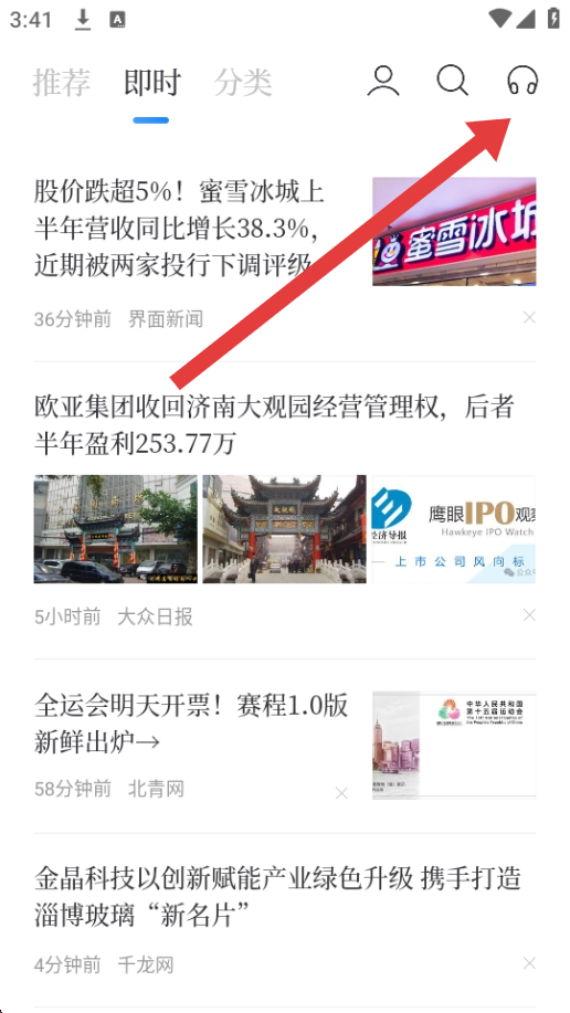 1、打開百度新聞APP,進入新聞列表如即時板塊,點擊頁面右上角耳機形狀的語音播報圖標,開啟語音播放功能。