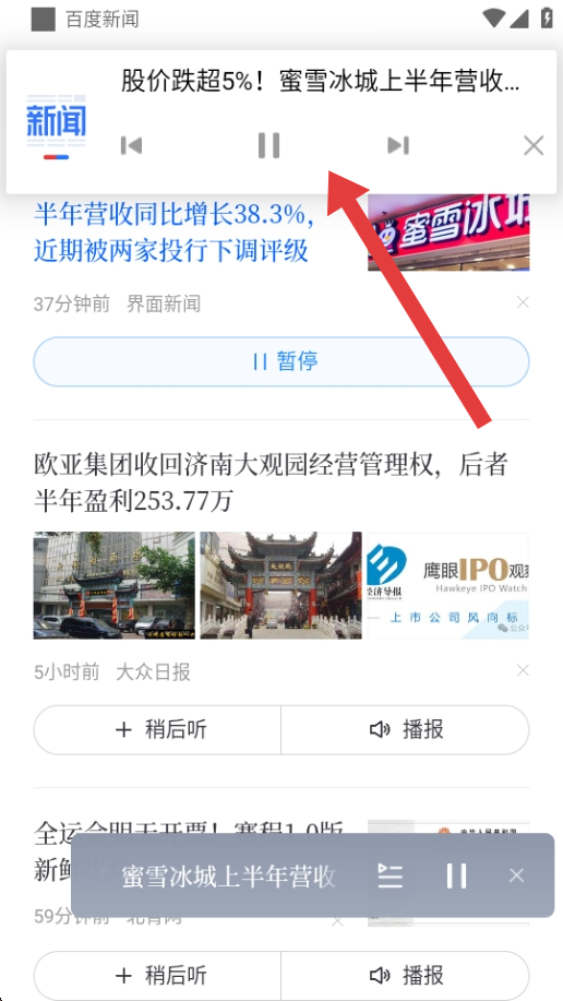 3、播放啟動后,頁面頂部彈出播放控制欄,可以進行暫停、切換等操作,便捷收聽新聞內容。