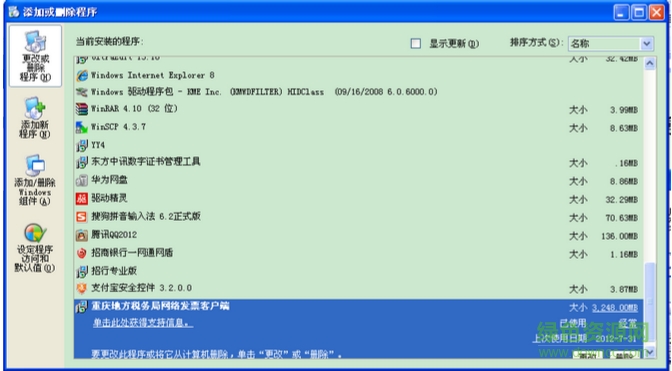 卸載網(wǎng)絡(luò)發(fā)票客戶端方式。在“控制面板”中“添加/刪除程序”里面找到“重慶市地方稅務(wù)局網(wǎng)絡(luò)發(fā)票客戶端”點(diǎn)擊“刪除”