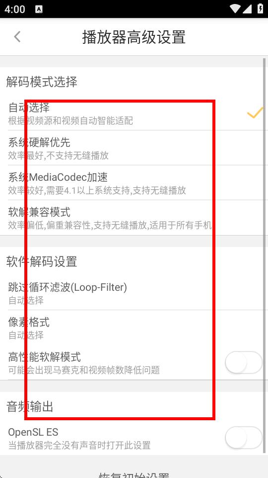 4、在播放器高級(jí)設(shè)置頁(yè)面,可對(duì)解碼模式、軟件解碼設(shè)置、音頻輸出等進(jìn)行設(shè)置,根據(jù)需求選擇合適的選項(xiàng)即可完成播放器設(shè)置修改。