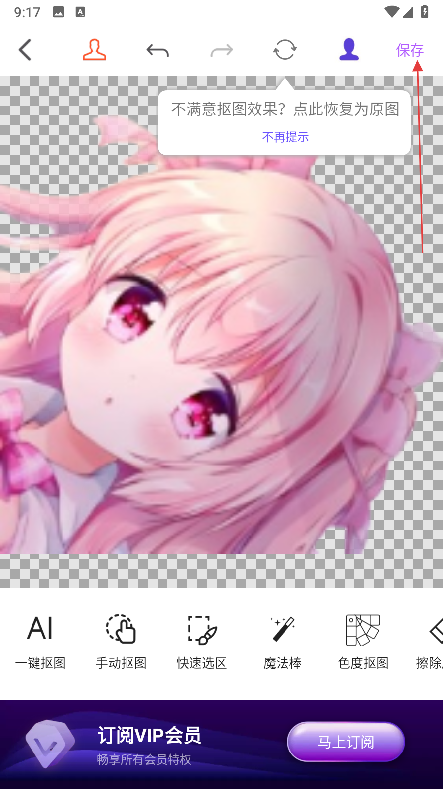 4、進入摳圖編輯界面后,應(yīng)用會自動進行智能摳圖,若需微調(diào)可使用手動摳圖,快速選區(qū)等工具,最后點擊右上角保存按鈕。