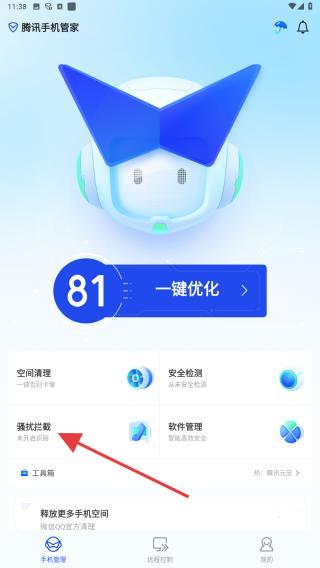 1、打開APP,在主界面點擊騷擾攔截的選項,根據(jù)箭頭所指向的區(qū)域,點擊即可跳轉(zhuǎn)下一關頁面。