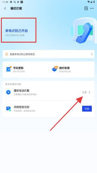 3、授權(quán)后,界面顯示來電識別已開啟,可進一步操作:點擊騷擾電話攔截右側(cè)的設置。