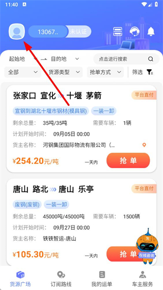 1、在鐵鐵智運(yùn)app貨源廣場(chǎng)頁(yè)面點(diǎn)擊左上角個(gè)人圖標(biāo),彈出功能菜單。