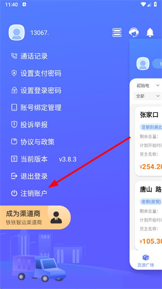 2、在功能菜單中點(diǎn)擊注銷賬戶選項(xiàng),彈出確認(rèn)注銷賬號(hào)框。