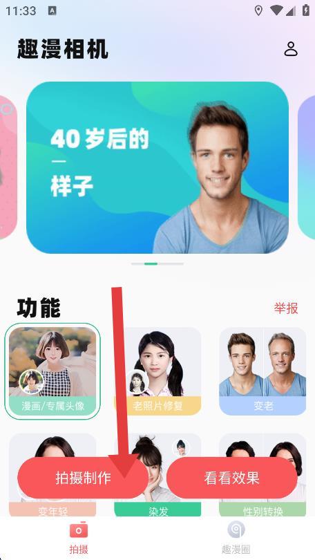 1、在首頁功能板塊中,點(diǎn)擊漫畫/專屬頭像下方的拍攝制作按鈕。