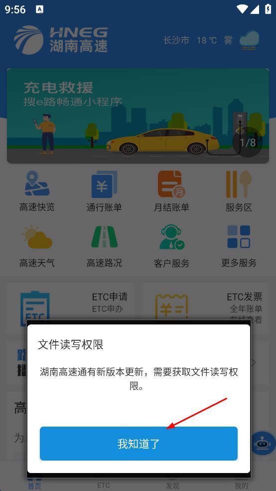 1、打開湖南高速,進入后看到文件讀寫權限提示彈窗,點擊我知道了按鈕。