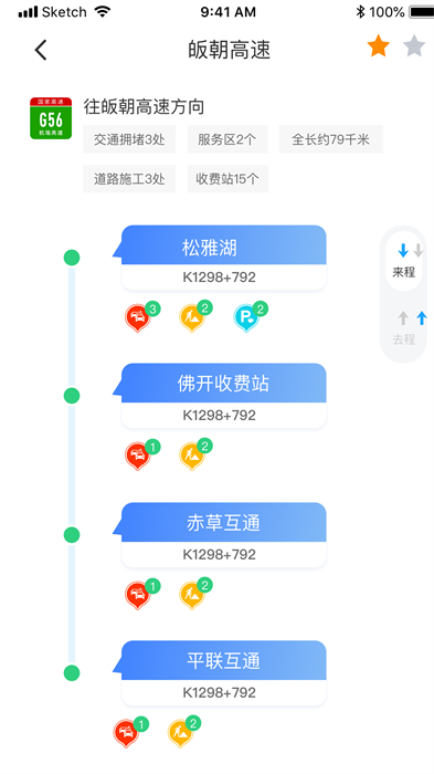 1.高速路網(wǎng):包括高速簡圖、分流預案、高速列表三個模塊。點擊進入“高速簡圖”模塊,全省高速公路實時路況即刻一覽無余。通過區(qū)分紅黃綠灰四種不同區(qū)塊,全省高速路段的事故、施工及擁堵等通行狀況一目了然。