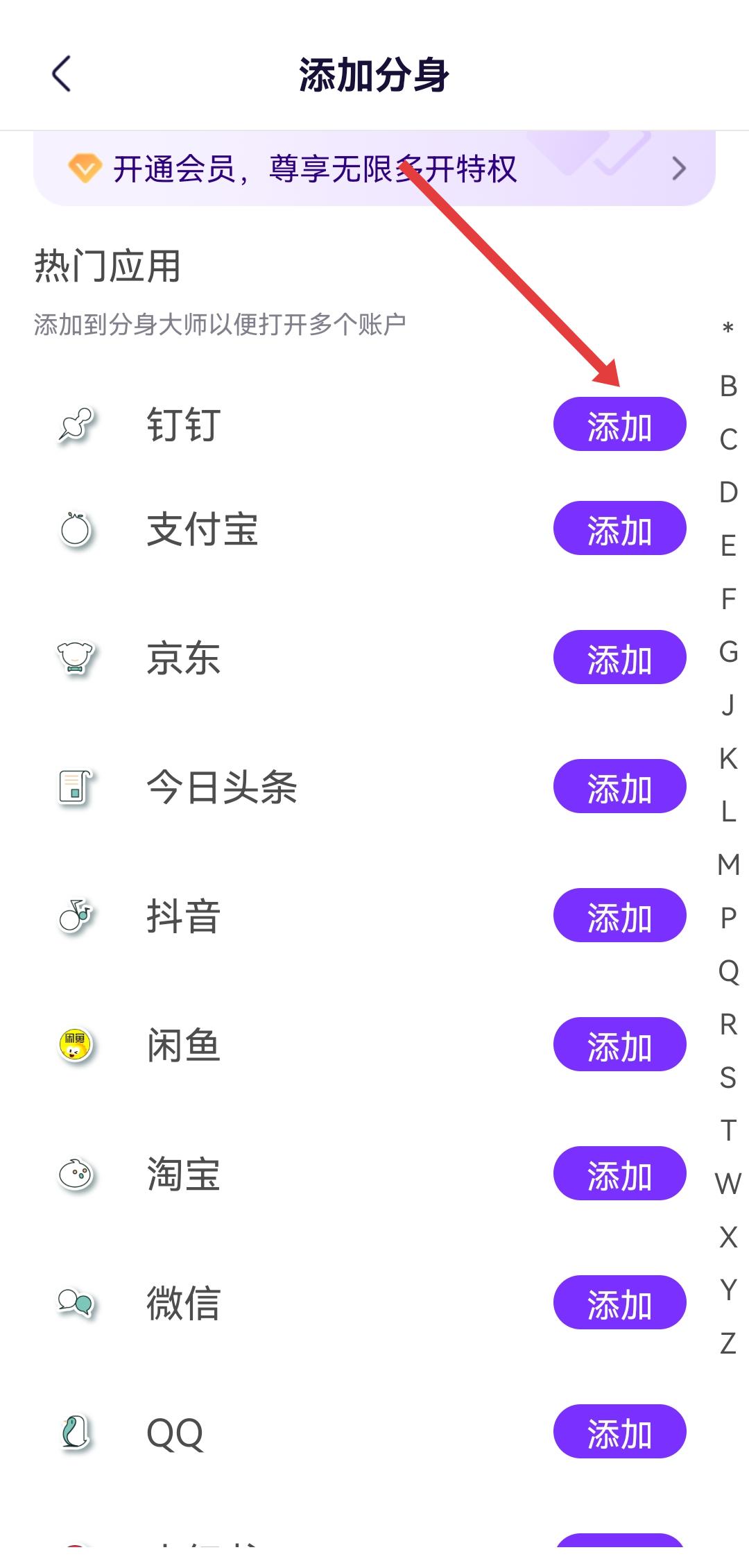 2、在添加分身頁面的熱門應(yīng)用列表中,找到要添加分身的應(yīng)用,點(diǎn)擊其右側(cè)的添加按鈕。