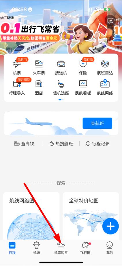 1、打開飛常準(zhǔn)APP,點(diǎn)擊底部導(dǎo)航欄中的機(jī)票購買。