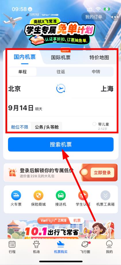 2、在機(jī)票預(yù)訂頁面,選擇是國內(nèi)機(jī)票還是國際機(jī)票,以及行程類型,接著輸入出發(fā)城市、到達(dá)城市和出發(fā)日期,點(diǎn)擊搜索機(jī)票。