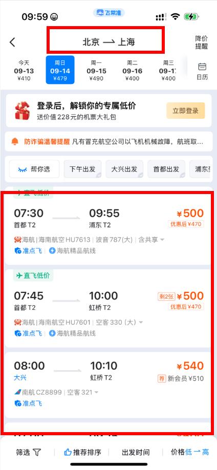 3、在搜索結(jié)果中瀏覽不同航班的起飛時間、航空公司、價格等信息,挑選適合自己的航班。