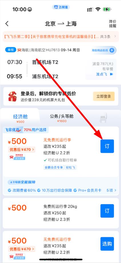 4、點(diǎn)擊所選航班對應(yīng)的訂或選購按鈕,按提示填寫乘機(jī)人信息、選擇附加服務(wù)并完成支付,即可成功預(yù)訂機(jī)票。