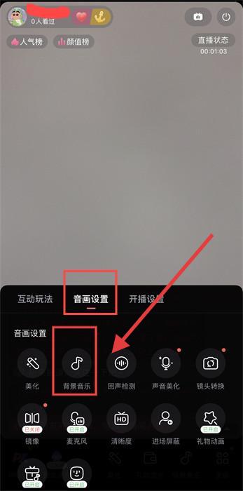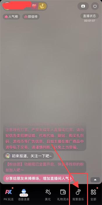 1、大家在登錄賬號(hào)之后,可以直接開(kāi)啟直播,并能看到下方有【背景音樂(lè)】,如下圖;