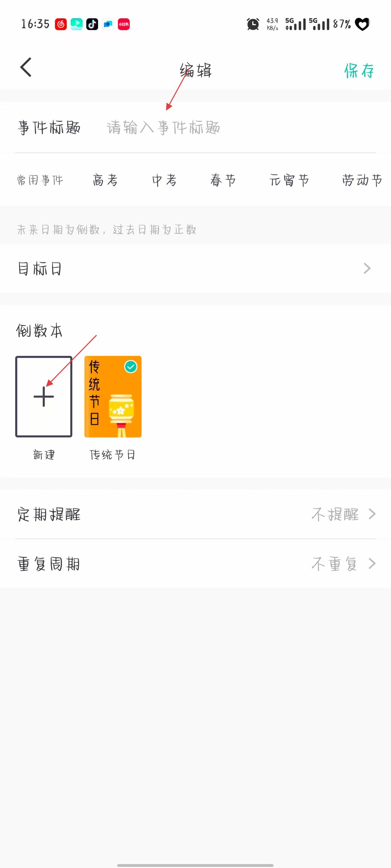 2、在事件創(chuàng)建頁面,點擊事件標題輸入框,輸入需要倒計時的事件名稱,還可選擇倒數本。