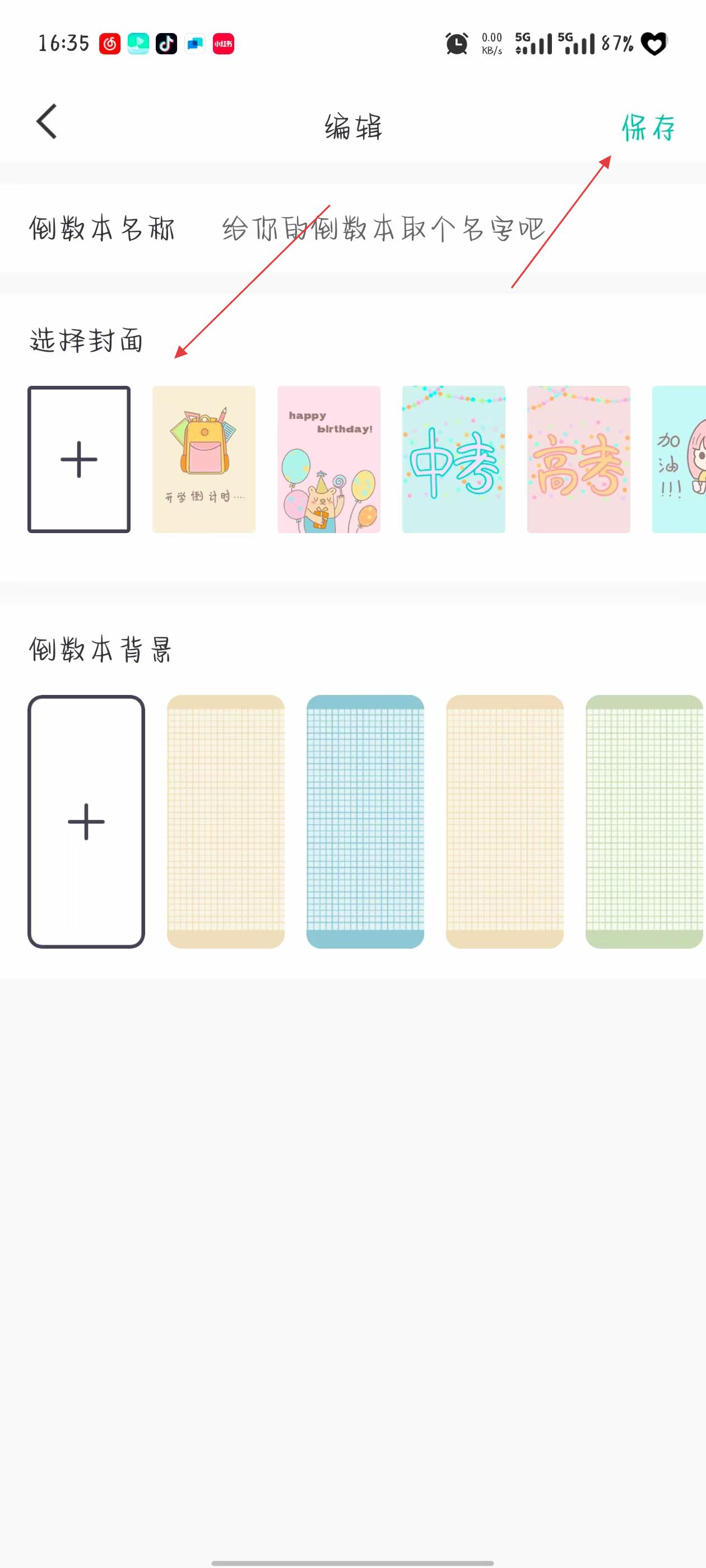 3、設置倒數本的名稱、封面和背景等個性化內容后,點擊右上角保存,完成倒數本的創(chuàng)建與設置。