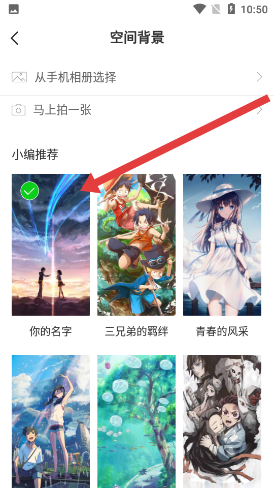 3、在空間背景界面中,可選擇從手機(jī)相冊(cè)選擇、馬上拍一張或小編推薦中的背景圖,點(diǎn)擊即可設(shè)置為空間背景。