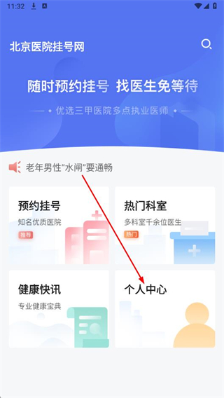 1、打開(kāi)北京醫(yī)院掛號(hào)網(wǎng)APP,點(diǎn)擊首頁(yè)中的個(gè)人中心。