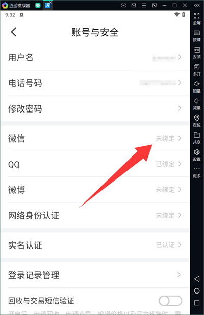 4、在賬號(hào)與安全功能界面中找到微信選項(xiàng),點(diǎn)擊后方的未綁定,之后跳轉(zhuǎn)到微信app中,用戶跟隨指引完成綁定即可。