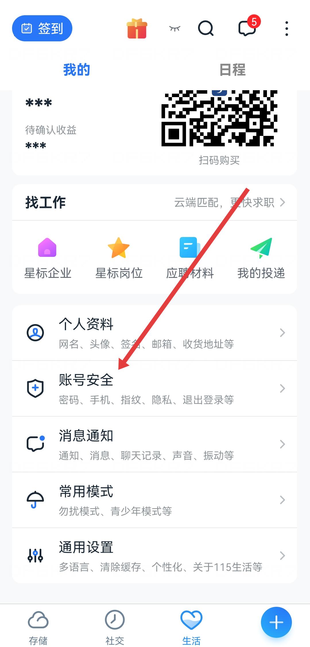 1、打開115生活A(yù)PP,進(jìn)入我的頁面,點(diǎn)擊賬號(hào)安全選項(xiàng),進(jìn)入賬號(hào)安全設(shè)置界面。