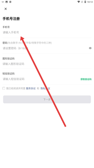 3、在跳轉(zhuǎn)到手機號注冊頁面中,點擊輸入框依次輸入對應(yīng)信息后,完成注冊操作。