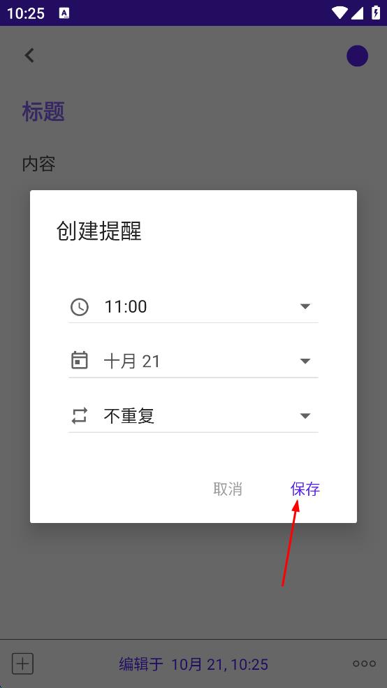 4、在創(chuàng)建提醒設(shè)置框中,設(shè)置好時(shí)間、日期和重復(fù)方式,點(diǎn)擊“保存”按鈕完成提醒創(chuàng)建。