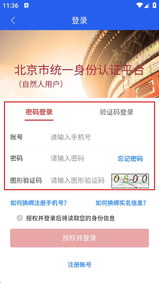 4、若選擇密碼登錄,在登錄界面輸入手機(jī)號、密碼以及圖形驗(yàn)證碼,確認(rèn)信息無誤后,點(diǎn)擊“授權(quán)并登錄”按鈕,完成登錄操作。