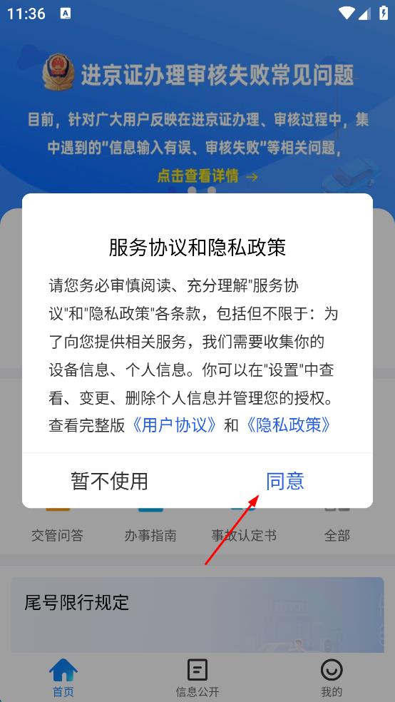 1、打開北京交管類APP,彈出服務(wù)協(xié)議和隱私政策提示,仔細(xì)閱讀相關(guān)內(nèi)容后,點(diǎn)擊“同意”按鈕,進(jìn)入APP主界面。