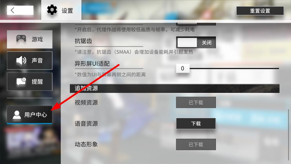 2、在設置界面中點擊左側列表里的用戶中心選項,彈出用戶中心操作窗口。