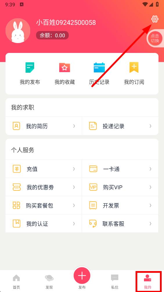 1、打開百姓網app,點擊底部我的選項,在頁面右上角,點擊設置圖標,進入設置界面。