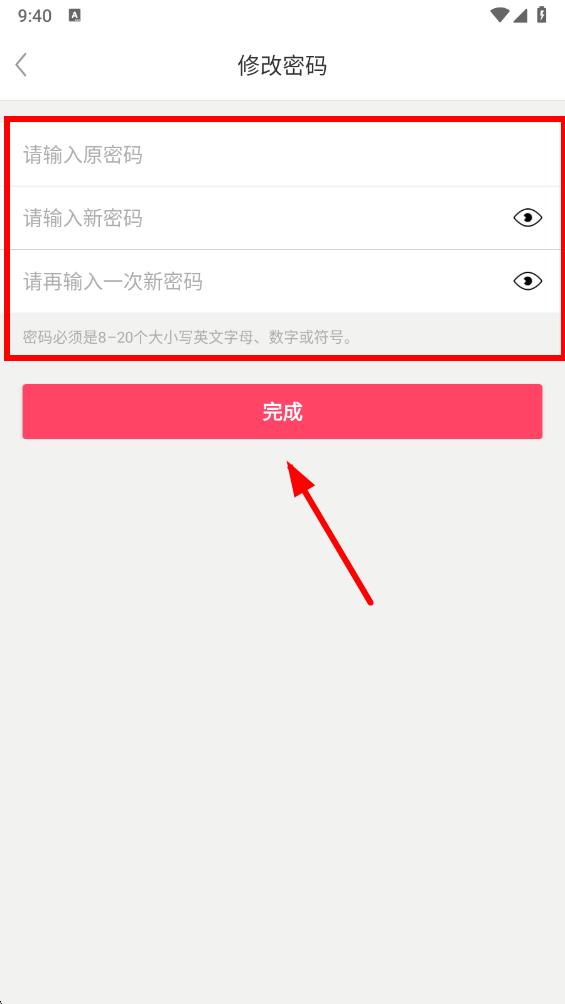 5、在修改密碼頁面,依次輸入原密碼、新密碼、再次輸入新密碼進行確認,然后點擊完成按鈕,即可成功修改密碼。