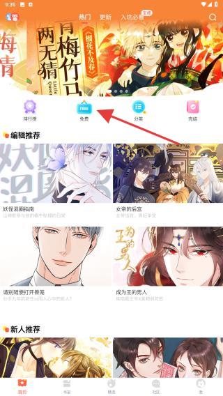 1、打開(kāi)漫漫漫畫(huà)APP,在首頁(yè)頂部導(dǎo)航欄找到免費(fèi)標(biāo)簽,點(diǎn)擊進(jìn)入免費(fèi)漫畫(huà)專(zhuān)區(qū)。