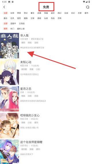 2、在免費(fèi)專(zhuān)區(qū)中瀏覽推薦的漫畫(huà),如:非人哉、未知心動(dòng)等,點(diǎn)擊你感興趣的漫畫(huà)封面。